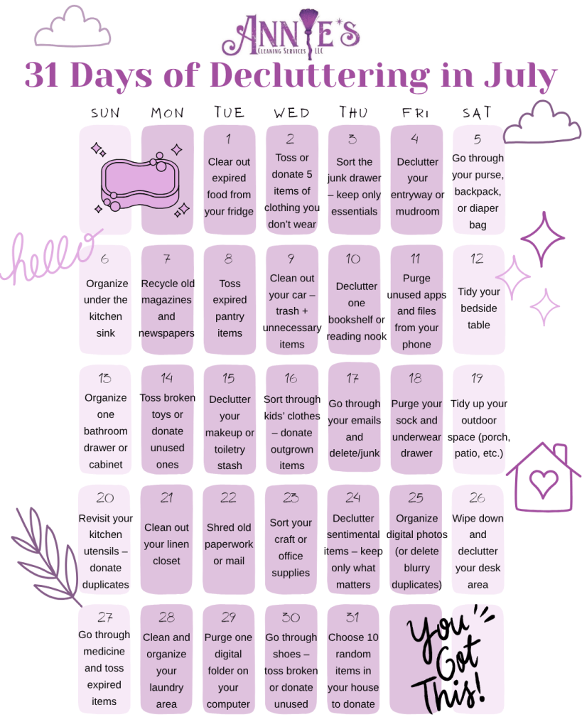 The clock starts now. Use our 31-Day Decluttering Calendar to guide you through the month — and don’t forget to share your progress on social media! Tag us @Annies Cleaning Services LLC and use #TidyInJuly so we can cheer you on!