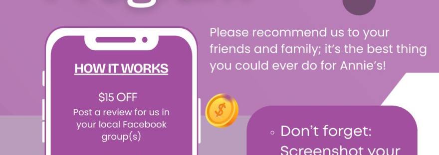 $15 OFF – Post a review for us in your local Facebook group(s).