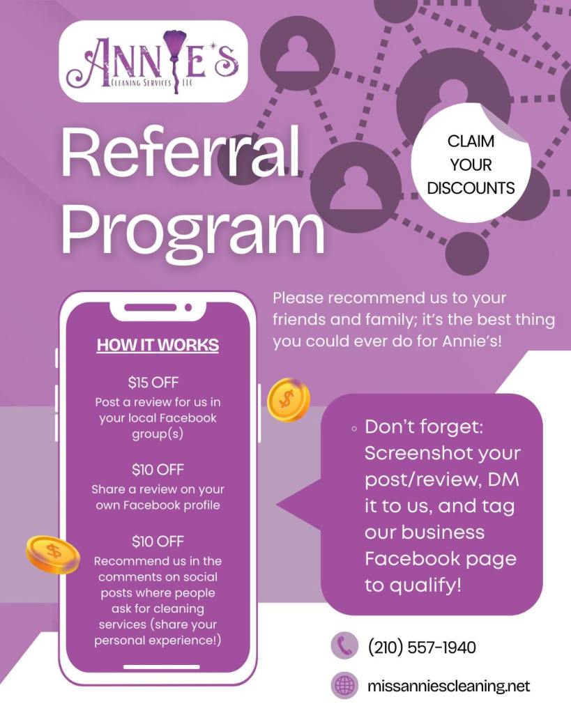 At Annie’s Cleaning Services, our clients are like family — and we couldn’t do what we do without your support! That’s why we’ve created a Referral Program that rewards you for spreading the word about your experience with us. It’s our way of saying thank you for being part of the Annie’s family.