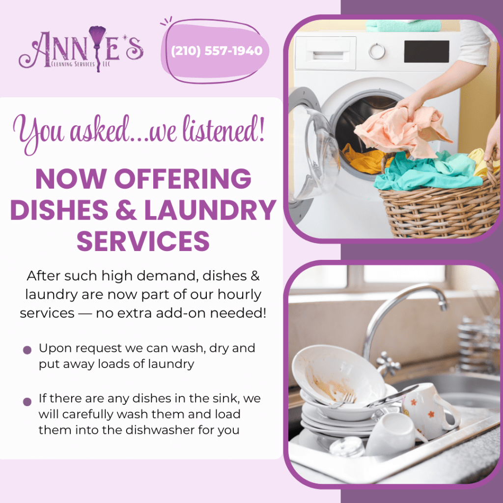 - Laundry Rooms: From dusting and wiping surfaces to cleaning floors and appliances, we ensure your laundry room is fresh and orderly. If requested at the time of booking, we can also wash, dry and fold a few loads of laundry.